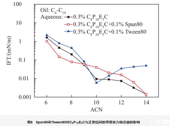 從圖中可以看出,由于Span80是油溶性很強的非離子表面活性劑,其在水中溶解性不好,只能與C8P10E5C分子形成混合膠束。因此,Span80不會影響C8P10E5C的親水親油平衡,表現為混合體系的nmin值與單獨C8P10E5C相似。同時,Span80會分配到油相中,然后從油相一側向界面吸附。這就造成油相烷烴碳數較低、界面張力較高時,Span80通過混合吸附,輕度降低界面張力;而當油相烷烴碳數較高、界面張力較低時,Span80通過競爭吸附,造成界面張力略有升高。但總體而言,油溶性非離子表面活性劑對界面張力影響不大。