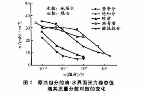 本文采取四組分分離方法(SARS)得到飽和分、芳香分、膠質(zhì)和瀝青質(zhì),利用醇堿萃取法得到酸性活性組分,系統(tǒng)研究了這五類原油活性組分與東辛地層水間的界面張力及界面擴張流變性質(zhì),有助于深入理解原油乳狀液的界面膜穩(wěn)定機理。