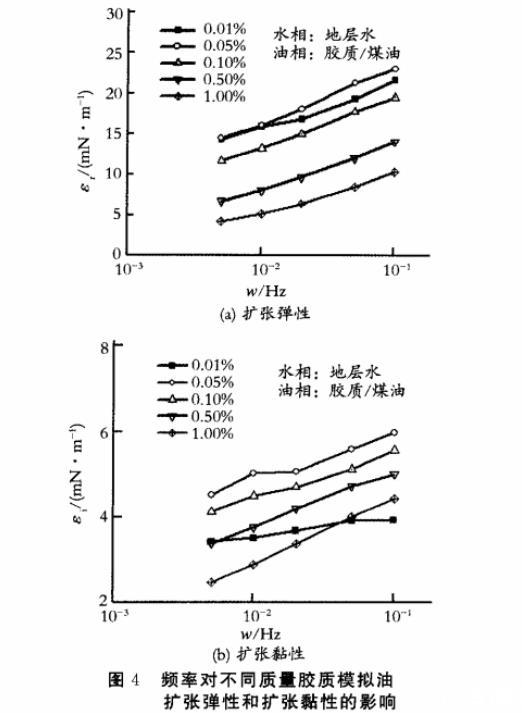 圖4頻率對不同質(zhì)量膠質(zhì)模擬油擴(kuò)張彈性和擴(kuò)張黏性的影響