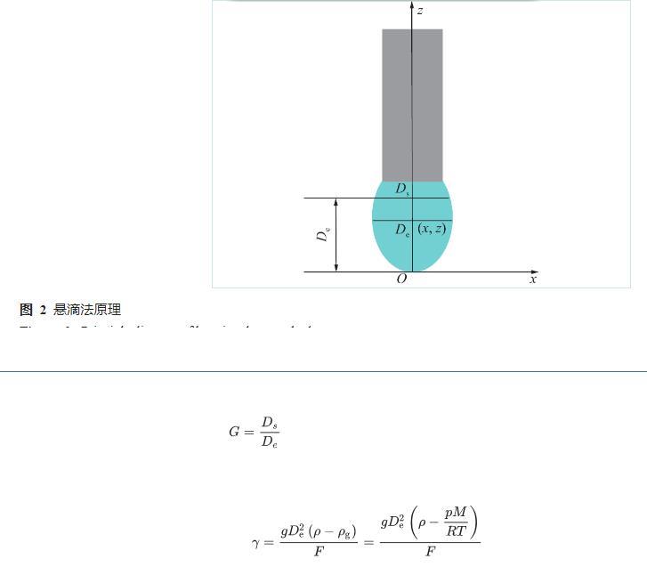 筆者采用懸滴法進(jìn)行水與瓦斯之間表面張力的測試,當(dāng)水滴被靜止懸掛在毛細(xì)管的管口處時,液滴的外形主要取決于重力和表面張力的平衡,通過對水滴外形的測定獲得水與瓦斯之間表面張力計(jì)算的相關(guān)參數(shù)。懸滴法原理圖如圖2所示,采用自開發(fā)的水與瓦斯之間界面張力分析軟件獲得式(1)中Ds、De,聯(lián)合水、瓦斯的密度、修正后的形狀因子(F)、重力加速度(g),基于式(2)計(jì)算水與瓦斯之間的表面張力。