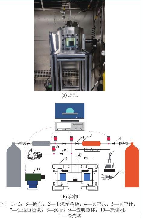 含瓦斯煤與水之間接觸角測試設(shè)備具備抽真空、充氣吸附、恒溫控制、滴水、光學(xué)成像及自動采集數(shù)據(jù)的功能,設(shè)備的實(shí)物圖及原理分別如圖1a—圖1b所示。