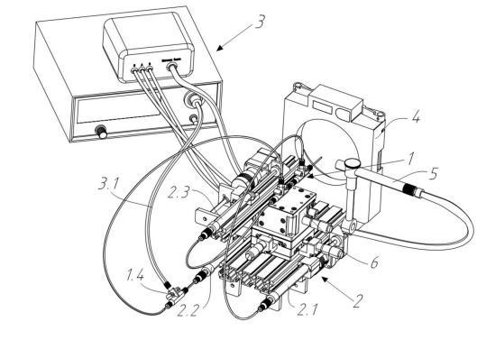 S1:通過所述集成化微流量泵控模塊2,基于預設的流速比例向樣品石英毛細管1.3輸送樣品液1.7,向內鞘液石英毛細管1.2輸送內鞘液1.6,向外鞘液不銹鋼管1.1輸送外鞘液1.5;