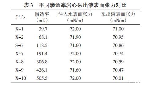 (1)實驗方法采用芬蘭Kibron EZ-Pi Plus便攜式動態(tài)表面張力儀檢測不同滲透率的巖心二次水驅(qū)采出液的表面張力。