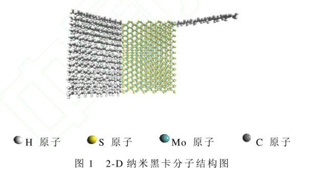 2-D納米黑卡具有雙層結構,由大小為30?×40?×12?的二硫化鉬納米片與直鏈烷烴構成。假設理想狀態下二硫化鉬納米片無晶格缺陷,其活性位點位置確定可參見文獻,且全部被C18H38直鏈烷烴接枝,如圖1所示。