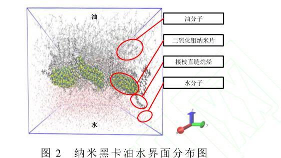 采用SPC/E模型描述水分子間相互作用,該模型中由于H原子質量小,對水分子間的H—H和H—O相互作用可忽略不計。選取C10H22為油相,原子間的相互作用勢采用CHARMM勢函數來描述。VA8模型在研究二硫化鉬結構和振動特性時具有較高的準確性,故選取其來描述納米片原子間的相互作用。以直鏈烷烴為改性劑改變納米片的親油親水性,采用CHARMM力場來描述原子間相互作用。采用6/12 Lennard-Jones(LJ)計算水分子、油相分子和納米黑卡之間的相互作用,截斷半徑分別為10?和12?。所構建的油水界面體系由31 500個油分子和17693個水分子組成,并將納米黑卡置于所構建的油水界面體系中。如圖2所示,油水界面上層部分的碳氫鏈表示油分子,油水界面下層區域代表水分子。