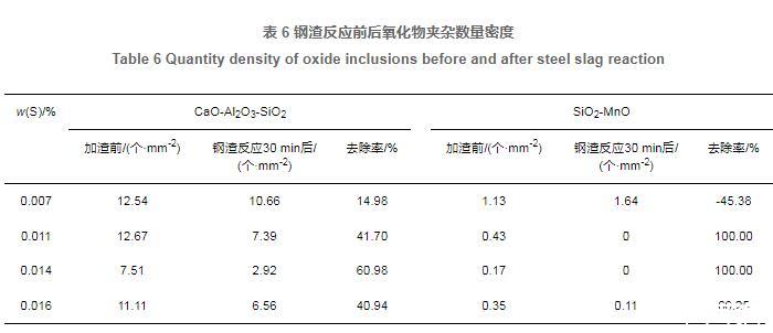 分析鋼渣反應(yīng)前后夾雜物的成分可知,重軌鋼中氧化物夾雜分為SiO2-MnO系和CaO-Al2O3-SiO2系兩類夾雜,圖8所示為兩類典型夾雜二維形貌。各類氧化物夾雜在鋼渣反應(yīng)前后數(shù)量密度變化見(jiàn)表6??梢钥闯?,鋼中主要夾雜為鈣鋁硅酸鹽,因此鋼渣反應(yīng)30 min后,鈣鋁酸鹽的去除率同總氧化物夾雜的去除率相近,隨著氧、硫質(zhì)量分?jǐn)?shù)的增高,鈣鋁酸鹽的去除率呈升高的趨勢(shì)。由于鋼中硅錳夾雜數(shù)量較少,且掃描面積有限,僅從以上表格統(tǒng)計(jì)的數(shù)量密度不具代表性,因此其去除率未呈現(xiàn)明顯規(guī)律。