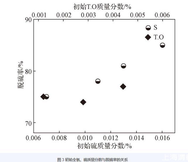 檢測(cè)每爐試樣1和試樣2的硫和全氧質(zhì)量分?jǐn)?shù),結(jié)果見(jiàn)表3。可以看出,固定鋼中全氧質(zhì)量分?jǐn)?shù),隨著初始硫質(zhì)量分?jǐn)?shù)的升高,鋼渣反應(yīng)30 min后,脫硫率逐漸增大,且穩(wěn)定在74%以上,終點(diǎn)硫質(zhì)量分?jǐn)?shù)可降低到0.002 6%以下;固定鋼中硫質(zhì)量分?jǐn)?shù),隨著初始全氧質(zhì)量分?jǐn)?shù)的升高,終點(diǎn)全氧質(zhì)量分?jǐn)?shù)可降低到0.001 4%以下,終點(diǎn)硫質(zhì)量分?jǐn)?shù)可降低到0.001 8%以下,皆滿足重軌鋼的成分要求。鋼中初始硫、全氧質(zhì)量分?jǐn)?shù)與脫硫率的關(guān)系如圖3所示。