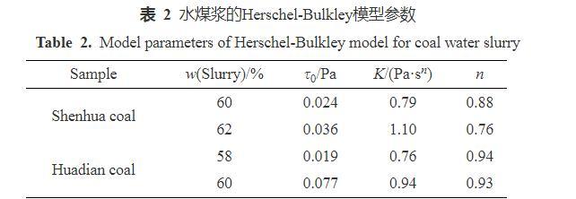 式中:是水煤漿黏度(Pa·s),為屈服應(yīng)力(Pa),為剪切速率(s?1),K為稠度系數(shù)(Pa·sn),n為流變指數(shù)。擬合關(guān)系式相關(guān)系數(shù)為0.98,擬合參數(shù)見(jiàn)表2。