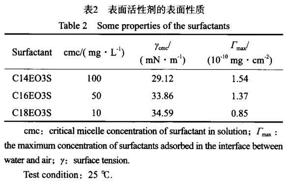 表面活性劑分子的結構特點決定了其在水溶液界面(液-氣)上的吸附特性,其極性基團指向水、非極性基團則指向氣。應用Gibbs公式可計算表面活性劑在單位溶液表面的最大飽和吸附量(Γmax),表面活性劑的表面性質見表2。由表2可見,C14EO3S,C16EO3S,C18EO3S表面活性劑在蒸餾水中的cmc分別為100,50,10 mg/L,對應的γcmc分別為29.12,33.86,34.59 mN/m。由此可見,表面活性劑在蒸餾水中的cmc隨疏水基鏈長的增加而降低。這是因為:一方面,脂肪醇聚氧乙烯醚磺酸鹽表面活性劑中含有親水的EO基團,其分子鏈呈鋸齒蜷曲形態排列,分子占據面積較大;另一方面,分子中的疏水基鏈長的增加,導致疏水基團的相互作用增強,對蜷曲的分子起到拉伸作用,同時會降低分子親水頭基面積,在這兩個相反作用中疏水基的相互吸引作用隨著疏水鏈長度的增加而明顯增強,使得表面活性劑分子排列更緊密,易于形成膠束。但cmc對應的γcmc則隨疏水基鏈長的增加而略有增加。