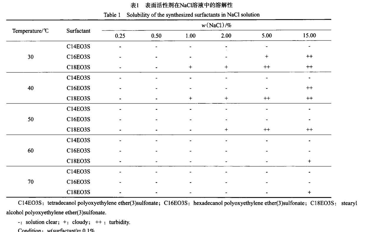 表面活性劑在NaCl溶液中的溶解性見表1。從表1可看出,在實驗溫度(30~70℃)內,C14EO3S在不同NaCl含量的溶液中均具有較好的溶解性;C16EO3S在30℃的5.00%(w)NaCl溶液中出現渾濁現象,但隨溫度的升高,溶解性增強;C18EO3S的溶解性較差,當溫度為30~40℃時,它在1.00%(w)的NaCl溶液中即開始出現渾濁現象,溶解性隨溫度的升高而逐漸增大,當溫度升至60℃后僅在15.00%(w)的NaCl溶液中出現渾濁現象。實驗結果表明,脂肪醇聚氧乙烯醚(3)磺酸鹽表面活性劑中的脂肪醇碳原子數越少(碳原子數小于16),在鹽溶液中的溶解性越好。