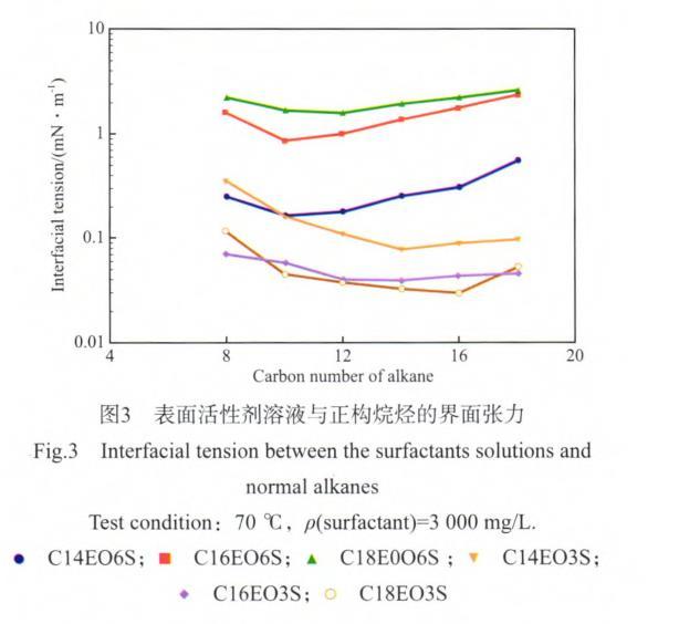 用模擬臨盤油田地層水將脂肪醇聚氧乙烯醚磺酸鹽配制成質量濃度為3 000 mg/L的溶液,在70℃下測得C14EO3S,C16EO3S,C18EO3S表面活性劑與原油間的界面張力分別為0.076,0.041,0.034 mN/m。表面活性劑溶液與正構烷烴的界面張力見圖3。