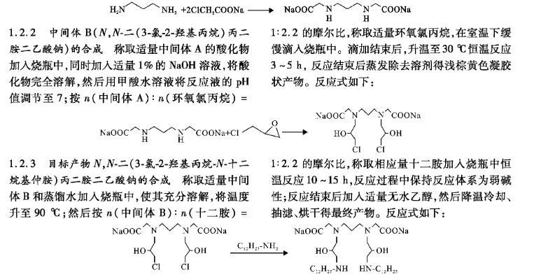 1,3-丙二胺與氯乙酸鈉反應合成中間體A(N,N-丙二胺二乙酸鈉);中間體A與環(huán)氧氯丙烷反應生成中間體B(N,N-二(3-氯-2-羥基丙烷)丙二胺二乙酸鈉);中間體B最后與十二胺反應生成目標產物,N,N-二(3-氯-2-羥基丙烷-N-十二烷基仲胺)丙二胺二乙酸鈉(簡稱GAC-312)。