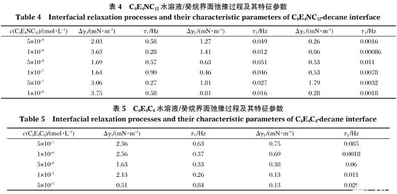 C8E4NC12和C8E4C8分子的界面弛豫過程的特征參數見表4和表5.對比表2和表4可以看出,C8E4NC12分子的表、界面均存在三種類型的弛豫過程,而且其特征弛豫時間十分接近,這證明了C8E4NC12分子在表面和界面的排列特征及分子間相互作用變化不大,與前文中的討論是一致的。