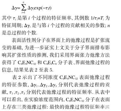 對比表3和表5則可以看出,C8E4C8分子的界面上仍然存在兩種類型的弛豫過程,不過其特征時間均明顯快于表面;更重要的是,隨體相濃度增加,C8E4C8分子在表面上以代表分子取向變化的慢過程為主,而在界面上則以代表擴散交換的快過程為主,這充分說明油分子改變疏水烷基取向、削弱分子間相互作用的機理是可靠的。