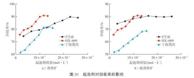 由圖10可知:在起泡劑用量相同條件下,HX-609在提升黃鐵礦回收率方面的效果顯著優于另外兩種起泡劑。對于磁黃鐵礦而言,2號油與HX-609的浮選效果相當。然而,從藥劑成本角度考量,2號油更具有優勢。