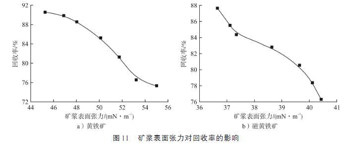 4)通過考察礦漿表面張力對浮選回收率的影響可知,礦漿表面張力與浮選回收率成反比關系,隨著礦漿表面張力的降低,黃鐵礦與磁黃鐵礦的回收率均顯著增加。這一規律可以用于指導生產實踐,即在硫化礦浮選中,可以嘗試通過降低礦漿表面張力來改善硫化礦的回收效果。