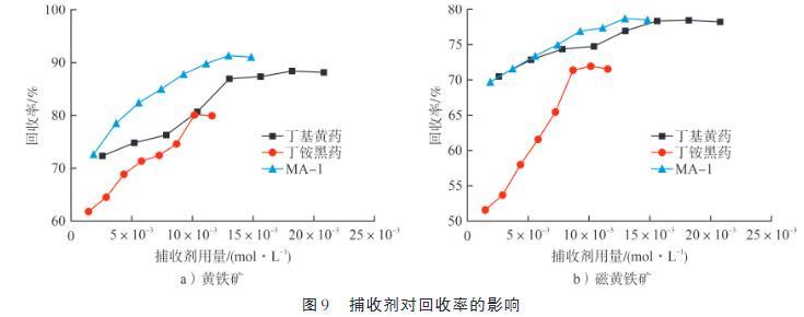 由圖9可知:黃鐵礦與磁黃鐵礦的回收率整體均隨著捕收劑用量的增加而逐漸提升;當回收率達到峰值后,繼續增加捕收劑用量,回收率趨于穩定狀態。相較于丁銨黑藥和丁基黃藥,MA-1作為黃鐵礦的捕收劑性能更佳。在磁黃鐵礦的浮選過程中,使用丁基黃藥和MA-1作為捕收劑時,回收率差異不顯著。鑒于實際生產過程中簡化藥劑制度和降低藥劑成本的考量,丁基黃藥更適宜作為磁黃鐵礦捕收劑。