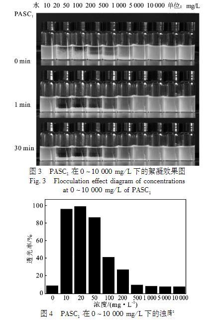 PASC1的絮凝效果見圖3、圖4.PASC1濃度為10——50mg/L時,透過率接近100%,繼續增加PASC1的濃度,體系重新變得渾濁。隨著PASC1濃度的進一步增加,體系的透過率降低,粘土顆粒懸浮體系重新穩定。粘土顆粒的表面由于同構取代而帶負電荷,這意味著需要陽離子達到電荷平衡。對于鈉基膨潤土(Na——BT),Na+離子被吸引到層空間中。當Na——BT與水接觸時,水可進入晶層內部,使可交換陽離子解離,在晶層表面建立擴散雙電層,從而產生負電性。