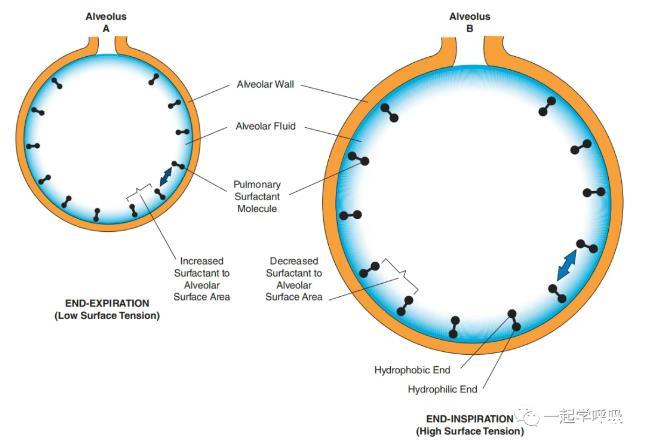 肺表面活性物質(Pulmonary surfactant,PS)是由II型肺泡上皮細泡合成和分泌的一種磷脂蛋白混合物,由磷脂(約90%)和蛋白質(約10%)組成。肺表面活性劑中主要的表面張力化學物質是二棕櫚酰磷脂酰膽堿(Dipal mitoyl phosphatidylcholine,DPPC)。DPPC分子既有疏水(水不溶性)端,也有親水(水溶性)端。這種獨特的疏水/親水結構使DPPC分子定位于肺泡氣液界面,使親水端朝向液相,疏水端朝向氣相。肺泡氣液界面的DPPC分子導致表面張力按其與肺泡表面積的比值成比例下降。當肺泡尺寸減小(呼氣)時,DPPC占肺泡表面積的比例增加,從而增加DPPC分子的作用,并導致肺泡表面張力降低。相反,當肺泡尺寸增加(吸入)時,DPPC相對于肺泡表面積的含量減少(因為當肺泡大小變化時表面活性劑分子的數量不變),從而降低DPPC分子的作用并導致肺泡表面張力增加。