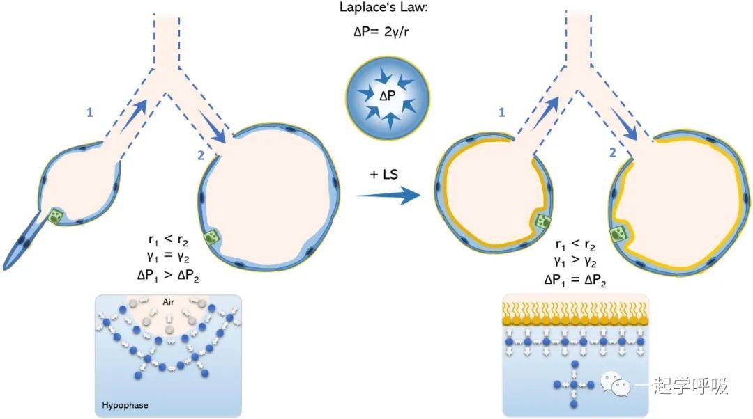 ▲肺泡Laplace定律的示意模型。理想球形肺泡的內壓由Laplace定律定義為ΔP=2γ/r。因此,小半徑的肺泡(肺泡1)相對于大半徑的肺泡(肺泡2)具有更高的內壓。在沒有功能性表面活性劑膜的情況下,肺泡1傾向于向肺泡2塌陷,這就允許了肺泡大小的不均勻性。然而,在表面活性劑的存在下,由于水-水-和水-空氣相之間均勻產生分子間力,避免了氣-液界面的彎曲并避免了肺泡塌陷,表面張力降低。LS是肺表面活性劑。