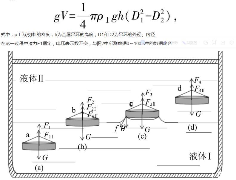 式中,ρⅠ為液體I的密度,h為金屬吊環的高度,D1和D2為吊環的外徑、內徑.