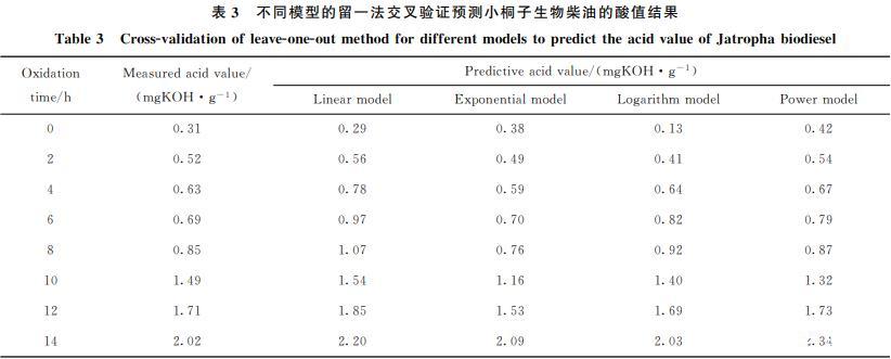 留一法交叉驗證是建立預測模型的一種常用方法,從N個觀測數(shù)據(jù)中選擇一個觀測數(shù)據(jù)作為驗證數(shù)據(jù),然后使用剩下的(N-1)個觀測數(shù)據(jù)擬合一個模型,并用驗證數(shù)據(jù)來驗證模型的精度,如此重復N次。考慮到數(shù)據(jù)量以及相關(guān)性,筆者利用Excel建立了線性、指數(shù)、對數(shù)、乘冪4種預測模型,對小桐子生物柴油酸值的預測結(jié)果見表3。