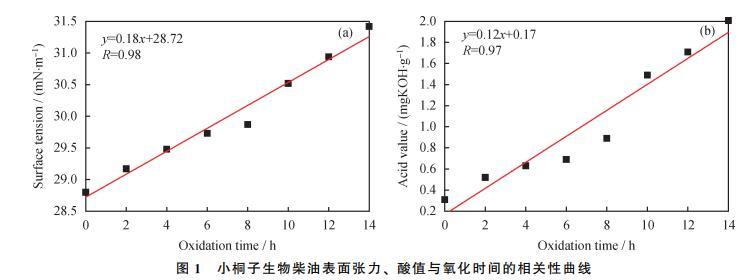 將氧化時間分別與小桐子生物柴油的表面張力、酸值進行相關(guān)性分析,結(jié)果如圖1所示: