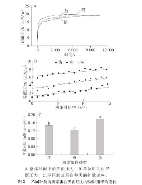 由圖2可知,不同種類肌漿蛋白的動力學擴散速率間存在差異性。蛋白質分子在界面上的擴散速率受其粒徑大小的影響,而本實驗結果更能解釋這一現象。在前述理化指標中,粒徑大小為雞肉肌漿蛋白>豬肉肌漿蛋白>魚肉肌漿蛋白,而在本部分擴散速率大小為雞肉肌漿蛋白<豬肉肌漿蛋白<魚肉肌漿蛋白。這可能是由于大粒徑的肌漿蛋白產生的空間位阻在一定程度上削弱了表面疏水性提高帶來的吸附速率增加。而且魚肉肌漿蛋白的擴散速率較豬肉和雞肉肌漿蛋白間顯著較大(P<0.05),但雞肉與豬肉肌漿蛋白之間的擴散速率卻無顯著性差異(P>0.05)。