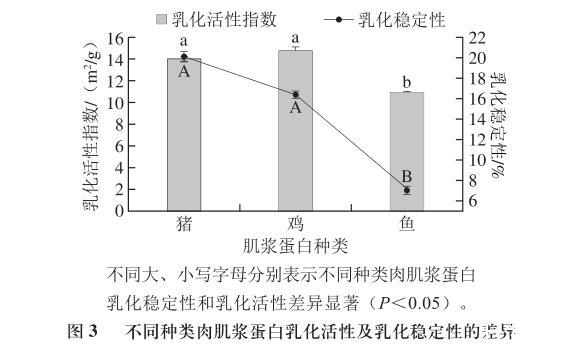 圖3不同種類肉肌漿蛋白乳化活性及乳化穩定性的差異