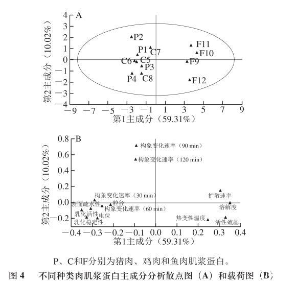 圖4不同種類肉肌漿蛋白主成分分析散點圖(A)和載荷圖(B)