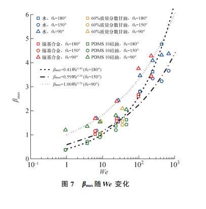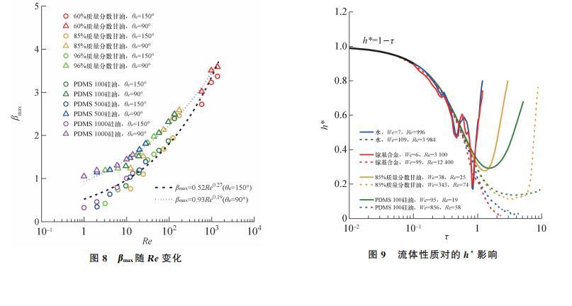 如表1所示,文指出在黏性力主導區(qū)(P>1)存在規(guī)律βmax∝Re0.2.本文在黏性力區(qū)的研究采用3種質量分數(shù)的甘油溶液、3種型號的PDMS甘油,黏度變化范圍為10——970 mPa·s,跨越近3個數(shù)量級。其中,黏度極高的PDMS1000硅油在低速碰撞壁面時有Re=1.
