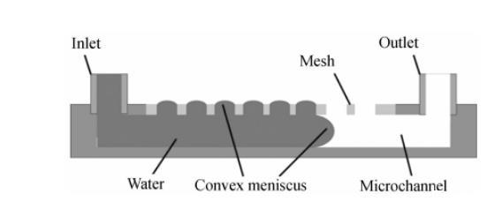 氣溶膠到水溶膠的采樣,一方面要求管道是開放的,以保證空氣中的生物質(zhì)能夠進(jìn)入液體;另一方面為了避免液體在流動(dòng)過程中外泄,管道必須封閉。本文設(shè)計(jì)了一種開放的管道,其頂部開放面覆蓋有疏水柵網(wǎng),如圖1所示。疏水柵網(wǎng)孔中的水在表面張力的作用下會(huì)形成一個(gè)彎月面,阻止水從柵網(wǎng)孔中流出。這樣空氣中的生物質(zhì)就能通過柵網(wǎng)孔進(jìn)入管道,同時(shí)管道中的液體可以穩(wěn)定流動(dòng)而不會(huì)外溢。
