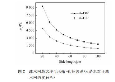 其中:sigma為液體表面張力,a為柵網(wǎng)方孔的邊長,theta為液體對(duì)于柵網(wǎng)的接觸角。計(jì)算中假設(shè)水溫為20^{circ}C,此時(shí)水的表面張力系數(shù)sigma=0.0728~N/m(后面計(jì)算中都采用此參數(shù))。最大許可壓強(qiáng)Pb和孔邊長的關(guān)系如圖2所示,可以看到采用疏水性好、網(wǎng)孔小的柵網(wǎng)可以得到更大的Pb。