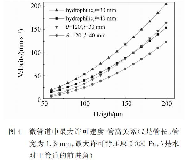 利用約束條件式(5)或(6),可以得到管道中液體的最大許可速度。為了簡化分析,假設出口處壓強為0。計算中假設管道各個壁面性質相同。利用式(4)計算壓降時要求流動定常,當液體流過干燥管道時并不是定常流動,利用式(4)作近似計算。最大許可速度與管道高度的關系如圖4所示,包括疏水管道和親水管道兩種情況。可以看出,管高一定時,在親水管道中最大許可速度較大,且最大許可速度隨管高增加而增大,隨管長的增加而減小。