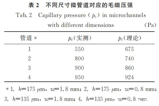 當水流過干燥管道時,表面張力產生的毛細壓強阻礙水的流動,此時的速度-壓強關系如圖8所示。在圖8的每條曲線上都有一個轉折點,且在轉折點之后水的流速迅速增加,轉折處的壓強被作為毛細壓強p。對于這種現象可解釋為在壓強小于毛細壓強的時候,水只能在重力作用下極緩慢流動,由于速度極慢,沿程水頭損失可忽略不計;當壓強大于毛細壓強時,黏性力和壓強差平衡,這時的流速增加較快。毛細壓強Pc的實測值和理論值如表2所示。水對于PDMS和壓敏膠的前進角都是120°,對于Teflon涂膜的柵網接觸角是150°(芬蘭Kibron公司生產的Delta-8全自動高通量表面張力儀)。實驗結果與理論計算一致。