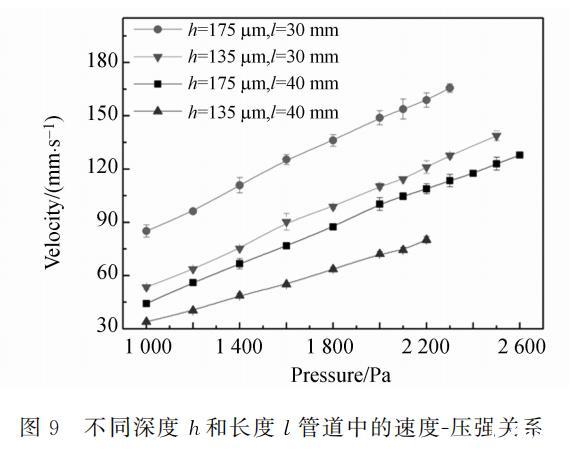 管道中充滿水時的速度-壓強關系如圖9所示。管道截面尺寸主要通過等效水力直徑影響摩擦阻力系數。由于管道深度遠小于寬度,管道的等效水力直徑取決于管道深度,故這里固定管道寬度而對不同深度的管道進行比較分析。由圖9可知,壓強一定,管道越深,長度越短,對應的流速越大。圖中每條曲線的最大壓強就是測量中每個管道的最大許可壓強,這些壓強值都大于表1中的最大許可壓強實測值。這一方面是由于柵網孔徑分布不均勻,另一方面是由于沿程水頭損失作用,管道中壓強分布沿流動方向減小,導致最大壓強沒有出現在孔徑最大的地方,從而得到的壓強大于靜止狀態下測得的最大許可壓強。