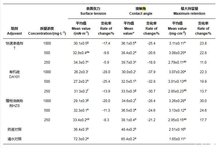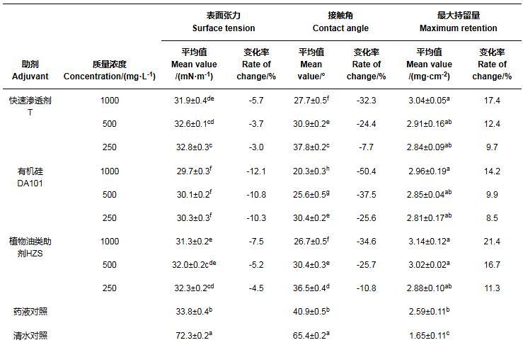 表2添加3種助劑后100 g/L聯(lián)苯菊酯乳油藥液表面張力、葉面接觸角和最大持留量的變化