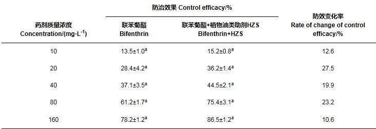 表6添加植物油類助劑HZS后100 g/L聯(lián)苯菊酯乳油對(duì)石斛菲盾蚧田間防效的變化