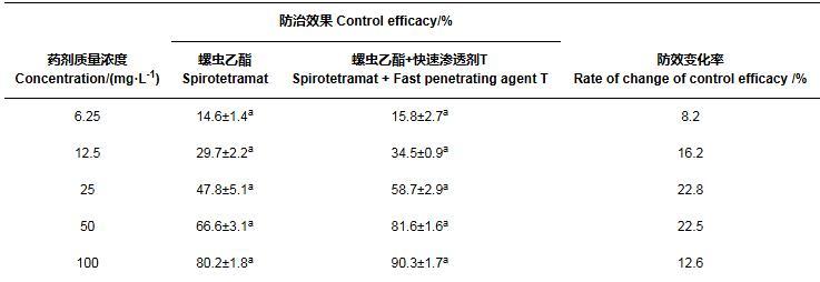 表5添加快速滲透劑T后22.4%螺蟲(chóng)乙酯懸浮劑對(duì)石斛菲盾蚧田間防效的變化