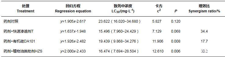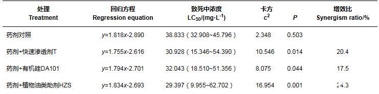 2.3噴霧助劑對(duì)2種藥劑防治石斛菲盾蚧室內(nèi)毒力的增效作用