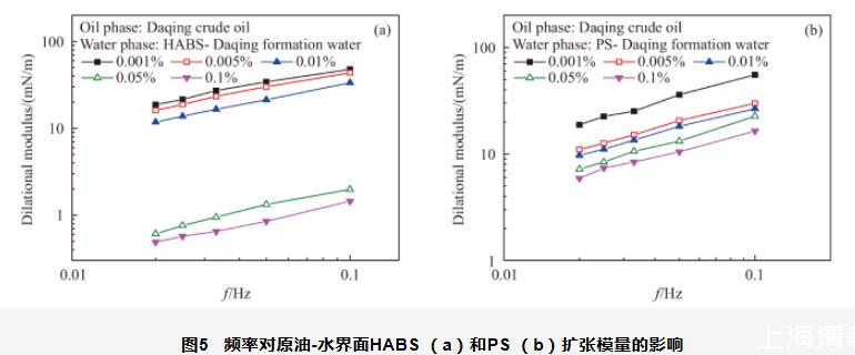 圖5頻率對原油-水界面HABS(a)和PS(b)擴張模量的影響