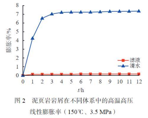 此外,目標區塊儲層段巖屑的線性膨脹率實驗結果如圖2所示。結果顯示,巖屑在清水中浸泡12 h的線性膨脹率為7.32%,在抗超高溫低滲透儲層鉆開液中浸泡的線性膨脹率為0.15%,表明該鉆開液體系抑制地層巖石水化膨脹性能效果好,有利于減少井壁巖石水化,穩定井壁和保障井筒安全。
