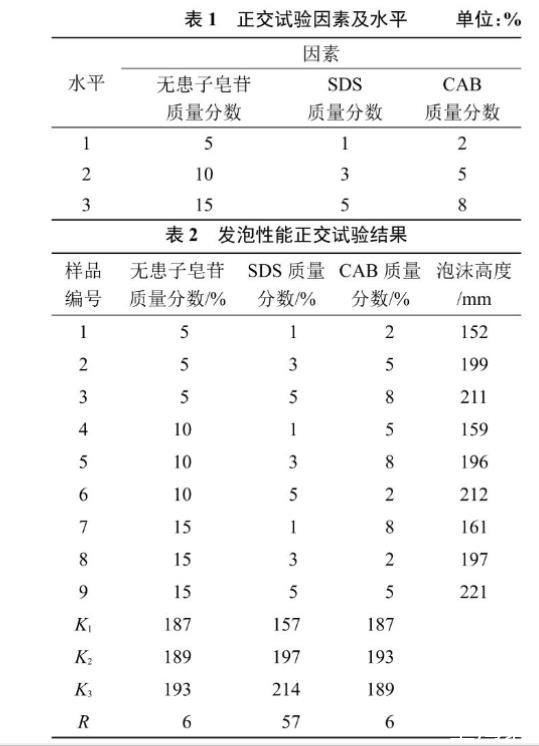 以發泡體系的復配組分(無患子皂苷、SDS、CAB 3種表面活性劑)為考察的3個因素,根據3種表面活性劑的發泡性能,每個因素選3個水平,選用L9(33)正交試驗設計優化泡沫滅火劑的配方,正交表設計如表1所示。