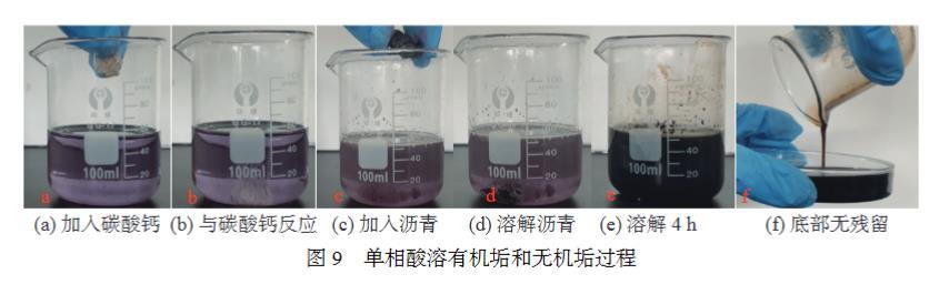 分別對鹽酸、芳烴溶劑、單相酸溶解有機垢、無機垢及其混合垢性能進行測試。實驗條件:90℃水浴,50 g溶液,2.5 g垢樣,溶解4 h,實驗結果見表2。從表2可以看出,單相酸對混合垢溶解效率遠高于單一解堵體系,具備同時解除有機垢、無機垢及其混合垢的能力。單相酸溶有機垢和無機垢過程圖片見圖9,當碳酸鈣加入后,單相酸與碳酸鈣反應較明顯;當瀝青加入后,常溫下溶解較慢,90℃水浴4 h后完全溶解;溶解后的殘液倒出后,燒杯底部無殘留,表明單相酸可以完全溶解有機垢(碳酸鈣)和無機垢(瀝青)。