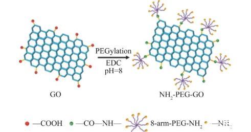 NH2-PEG-GO的制備方法:使用8-arm-PEG-NH2對GO表面進(jìn)行修飾(圖1)。取80 mL上述細(xì)胞破碎機(jī)處理后的GO溶液,加入16 mL質(zhì)量濃度為2 mg/mL EDC來活化GO表面羧基,然后將混合溶液在功率為570 W條件下超聲30 min(開1.5 s,關(guān)1 s),待分散均勻后,再用5%NaOH溶液來調(diào)節(jié)溶液酸堿性(pH=8),隨后將240 mg 8-arm-PEG-NH2加入,超聲反應(yīng)30 min后,再常溫攪拌反應(yīng)12 h,離心水洗后得到氨基修飾的GO,于室溫真空冷凍干燥2 d后,得到最終產(chǎn)物,將產(chǎn)物研磨備用。