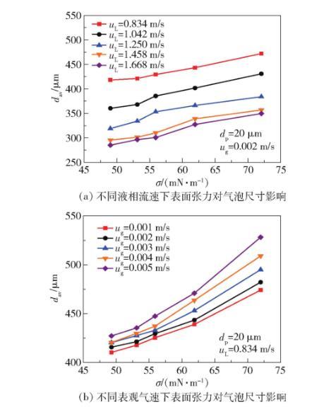 在表觀氣速ug=0.1-0.3 m/s范圍內(nèi),表面張力對氣泡尺寸的調(diào)控作用呈現(xiàn)非線性特征。當(dāng)ug>0.2 m/s時,高表觀氣速引發(fā)的慣性力(Fg=πd2ρgug/4)增強,部分抵消了低σ?guī)淼某叽鐪p小效應(yīng)。實驗數(shù)據(jù)顯示,在ug=0.3 m/s條件下,σ從72降至49 mN/m僅使dav減少18%,較ug=0.1 m/s時的32%減幅顯著降低。