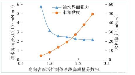 圖2 ACS-2高黏表面活性劑體系含量對界面張力和水相黏度的影響