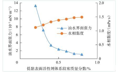 圖1 OBU-3低黏表面活性劑體系含量對界面張力和水相黏度的影響