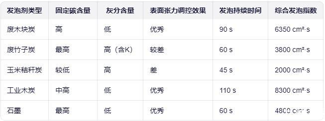 從數(shù)據(jù)可見,廢木塊炭和工業(yè)木炭因固定碳高、灰分低,表面張力調(diào)控能力優(yōu)秀,發(fā)泡持續(xù)時(shí)間長(zhǎng),綜合性能突出。廢竹子炭雖固定碳最高,但灰分中高鉀元素導(dǎo)致表面張力變化過(guò)快,泡沫穩(wěn)定性下降。