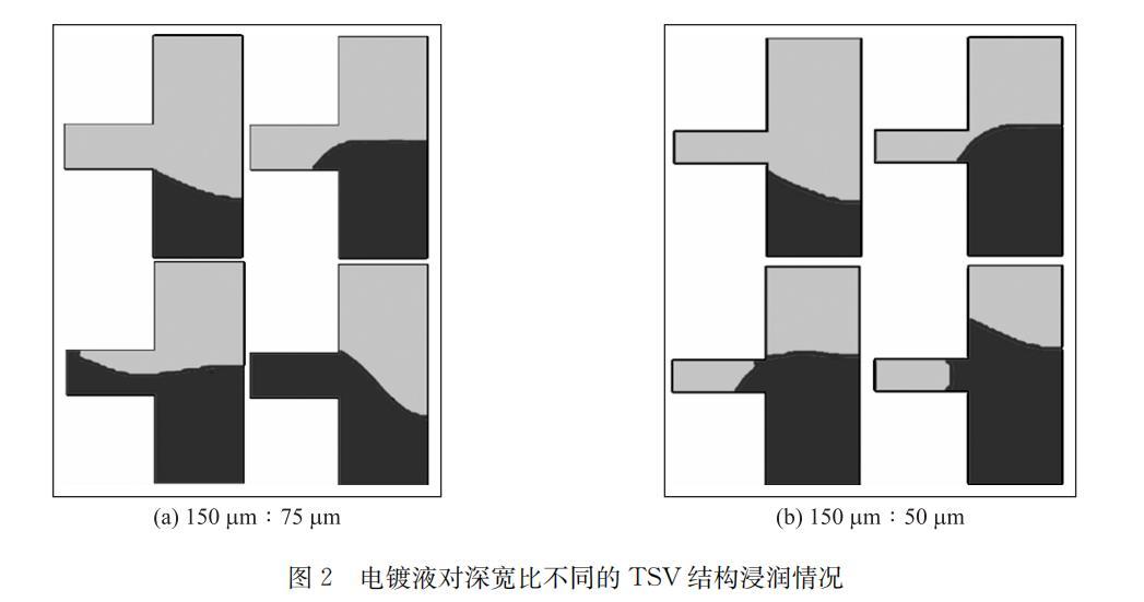 深寬比為150μm:75μm和150μm:50μm的TSV浸潤(rùn)仿真結(jié)果分別如圖2的(a)(b)所示,前者可以完全浸潤(rùn),后者在TSV底部形成氣泡。模擬結(jié)果表明如果不進(jìn)行充分潤(rùn)濕,深寬比大于2:1的TSV就會(huì)因不能完整浸潤(rùn)而在靠近TSV底部的位置形成部分表面緊貼TSV側(cè)壁的大氣泡,且該氣泡在之后的電鍍過(guò)程中難以排出,導(dǎo)致電鍍液無(wú)法接觸到TSV底部附近的位置,進(jìn)而形成較大空洞。